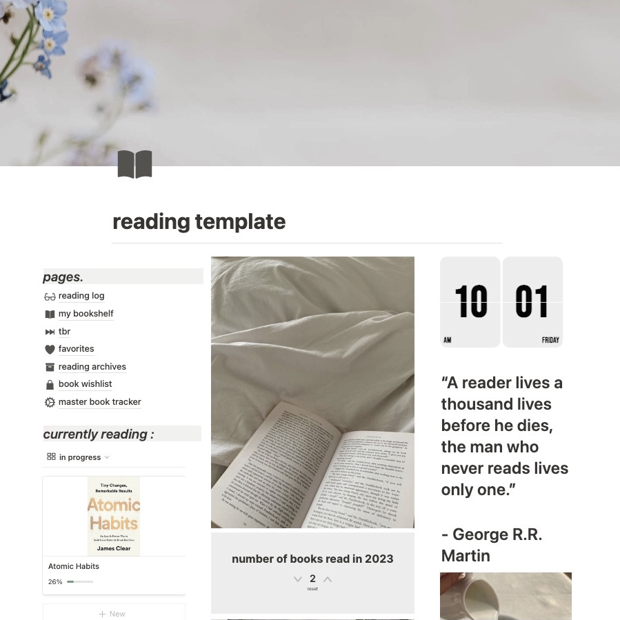 - reading log - for you to track and log your current reads, their progress and any notes/thoughts or quotes you might want to write down.